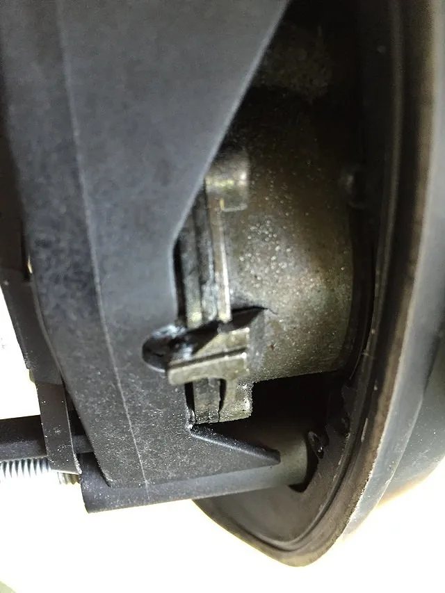 ミニのドアミラーを分解点検いたしますとモーター取り付け部に亀裂が入りガタが出て格納時にガタガタ音がでておりました。