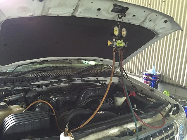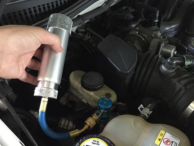 エクスプローラーのエアコン不調の原因の一つであるエアコンガス漏れはご相談の上今回は専用のエアコンガス漏れ剤を注入しまして漏れを止めます。