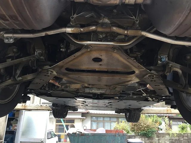 リフトアップして下回りのチェック、ブレーキの作動チェック、エンジン回りの消耗品やオイル漏れ等の点検、増し締め、調整作業を行います