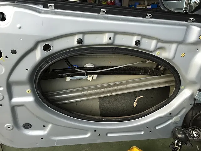 BMWミニのドアロック修理は内装や内張りを分解いたします。ドアガラスを専用特殊工具で脱着、パワーウィンドウレギュレーター、モーターを取り外します。