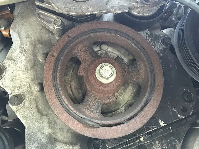 内部のゴムのバイブレーションダンパーfがエンジンの振動を吸収する役目がありますのでゴムが切れたりちぎれるとエンジンストップ、オルタネーター、パワステやエアコンなどが効かなくなる恐れがありますので早めの交換修理が必要です。