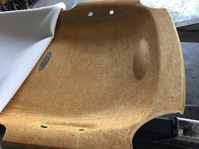 天井の剥がれや垂れによる修理は天井の生地を張替作業いたします。天井のルーフライニングを取り外しいたしまして剥がれた天井の生地を除去しましてルーフライニングを綺麗にいたします。