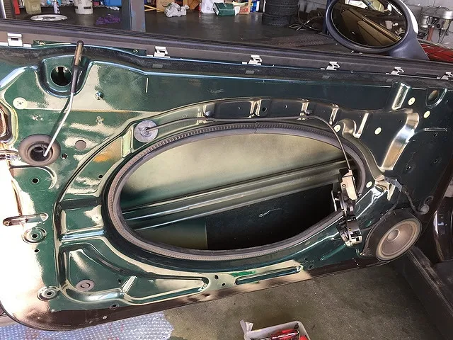 ドア内張りパネルを分解しドアガラスを取り外していきます。一つ一つが重要なパーツですので破損がないか一つ一つ丁寧に点検していきます。