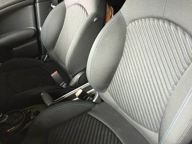 標準仕様のクーパーSクロスオーバーのスポーツシートです。ブルーステッチのスポーツシートでこのままでも十分かっこいいです。クーパーSは良いですね。