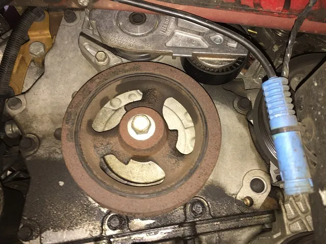 ●BMWR50BMWミニ水漏れクーラント漏れによりオーバーヒート故障修理作業、バイブレーションダンパー、クランクプーリ―、ベルト交換作業